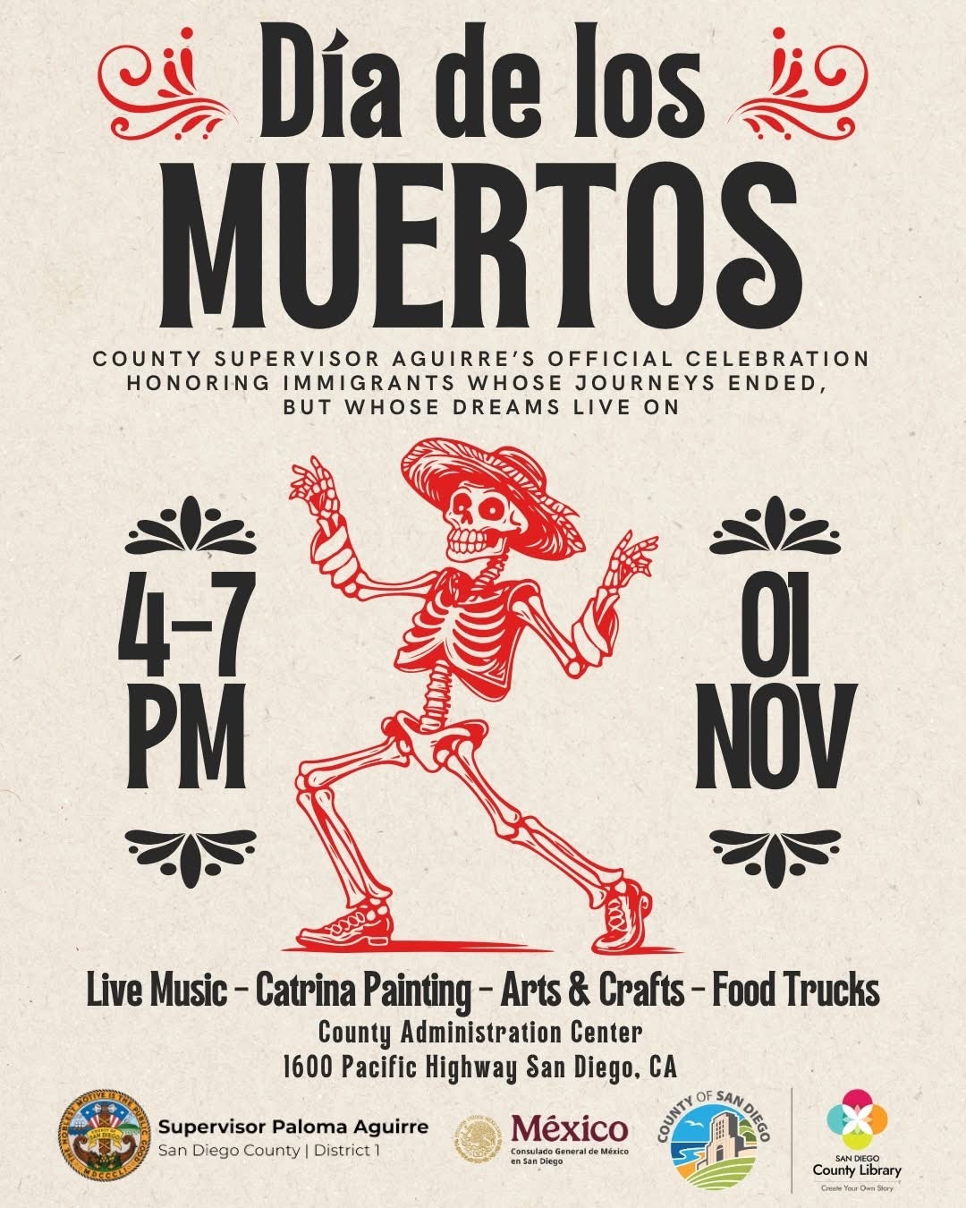 Honoring immigrants whose journeys ended, but whose dreams live on. Día de los Muertos is a cherished Mexican tradition that celebrates the lives and memories of those who have passed. Far from a day of mourning, it is a vibrant expression of love and remembrance—filled with music, color, and community. Please submit a photo of a loved one who immigrated to this country for us to print and include on the altar. Guests are also encouraged to bring a photo of a loved one to add to one of the community ofrendas honoring family, friends, and pets. You can also send photos to via email to District1community@sdcounty.ca.gov with subject line containing: Dia de los Muertos Photo.This year, we are also paying special tribute to our immigrant community. In a time of division and uncertainty, we come together to honor immigrants in San Diego whose courage, resilience, and hope defined their journeys—and to remember those whose lives ended but whose dreams live on. Enjoy live mariachi music, traditional folklórico performances, food trucks, Catrina painting, and family-friendly activities.